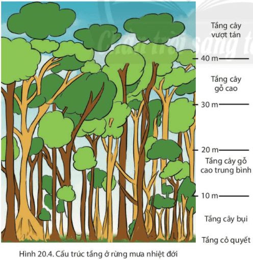 + Rừng gồm nhiều tầng, trong rừng có nhiều loài cây thân gỗ, dây leo chằng chịt; phong lan, tầm gửi, địa y bám trên thân cây.