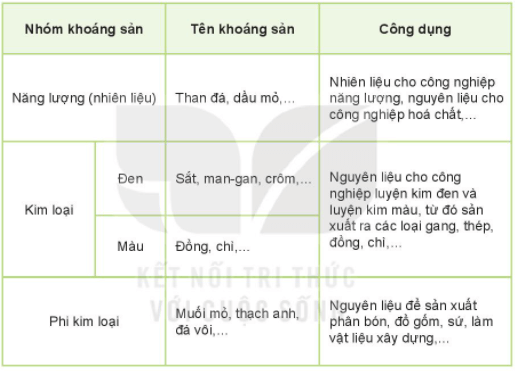 - Phân loại khoáng sản: Năng lượng, kim loại và phi kim loại.