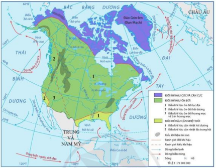 Giải thích: Theo chiều bắc-nam, Bắc Mỹ có 3 đới khí hậu là cực và cận cực, ôn đới và cận nhiệt đới (SGK trang 128)