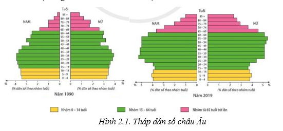 Bảng 1. Cơ cấu dân số theo nhóm tuổi của châu Âu năm 1990 và năm 2019 (đơn vị %)