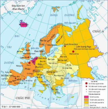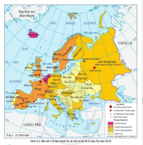 Hình 2.2. Bản đồ tỉ lệ dân thành thị và một số đô thị ở châu Âu năm 2019