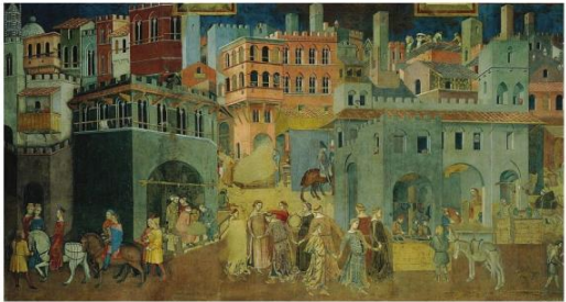 Thương nhân buôn bán tại đô thị Xê-na ở I-ta-li-a (tranh vẽ, khoảng thế kỉ XIII)