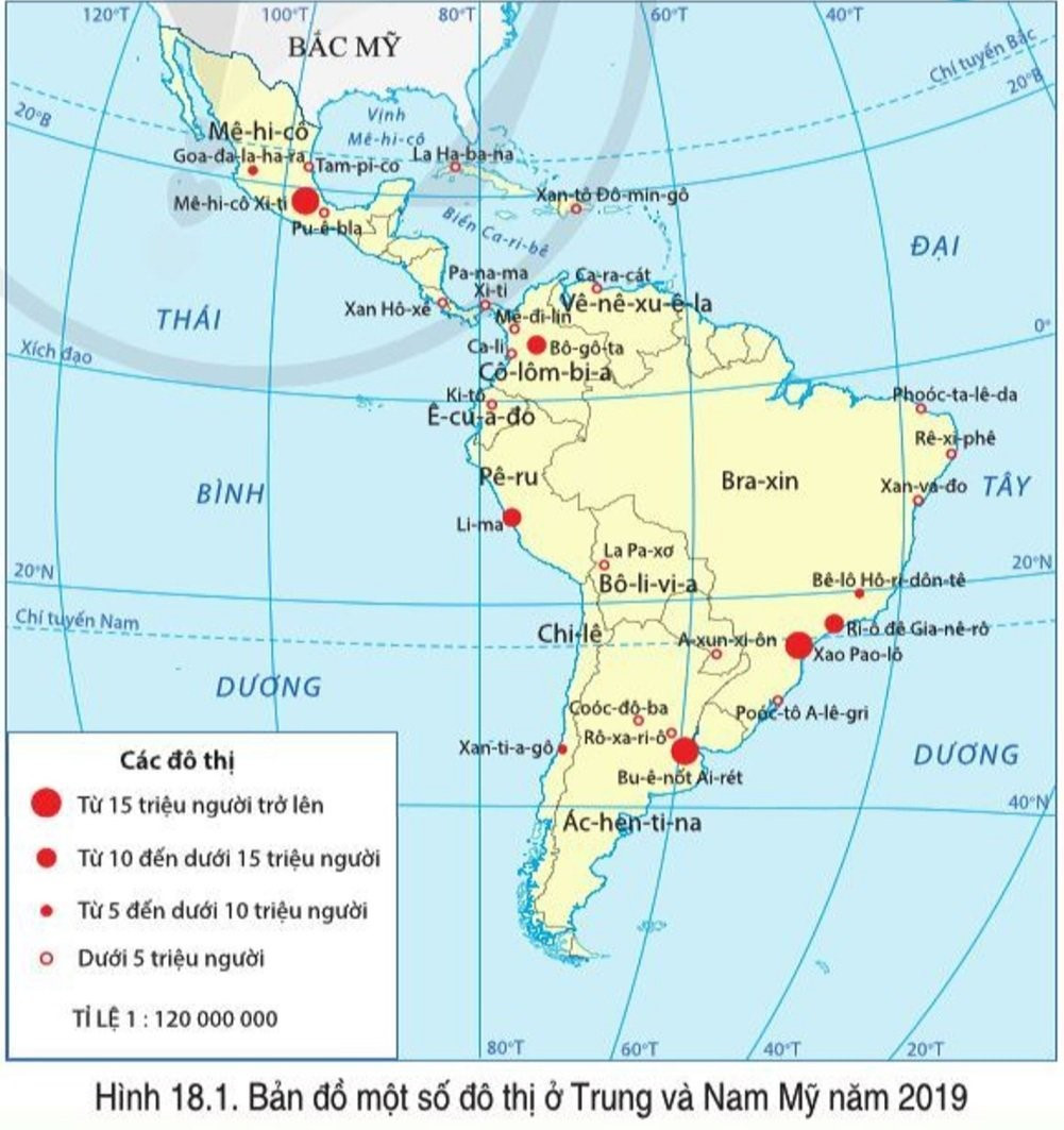Hình 17.1: Bản đồ phân bố dân cư và một số đô thị ở Trung và Nam Mỹ năm 2020 (SGK - trang 158).