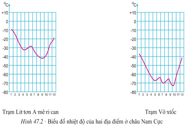 Nhiệt độ trung bình tháng ở rìa lục địa Nam Cực xuống tới -15oC đến -20oC còn ở vùng trung tâm đạt tới -60oC đến -70oC … (SGK - trang 177).