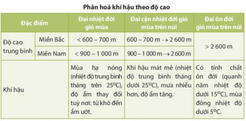 - Phân hoá theo độ cao: khí hậu Việt Nam phân hoá thành ba đai cao gồm: đai nhiệt đới gió mùa, đai cận nhiệt đới gió mùa trên núi và đai ôn đới gió mùa trên núi.
