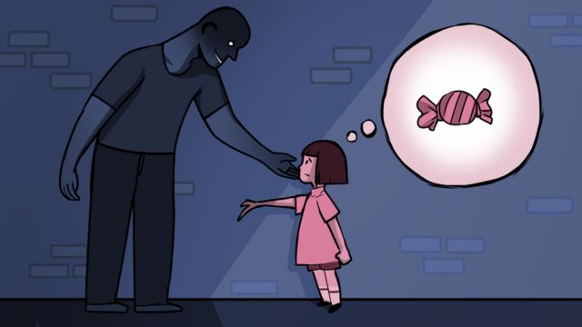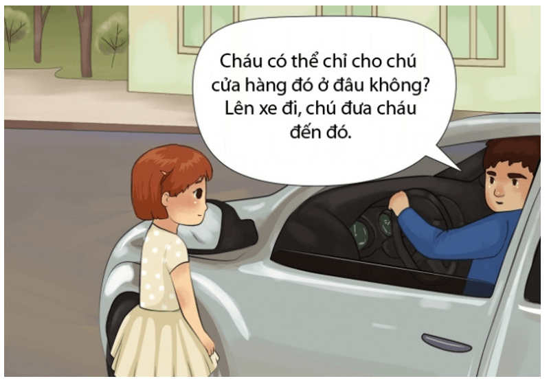 - Bạn nhỏ trong bức tranh minh họa có nguy cơ phải đối mặt với tình huống bắt cóc (bức tranh miêu tả: một người đàn ông lạ mặt đang dụ dỗ bạn nhỏ lên xe để chở tới một cửa hàng nào đó).