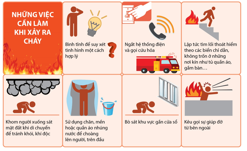 + Tìm cách thoát ra khỏi đám cháy và có thể hỗ trợ người khác tùy theo khả năng của mình.