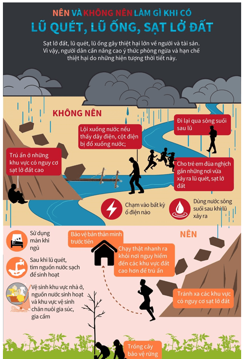 Giải thích: Không nên ra ngoài trời khi nghe có tin báo sắp xảy ra sạt lở đất, lũ quét, lũ ống hoặc đã và đang xảy ra các tình trạng đó nếu không thực sự cần thiết.