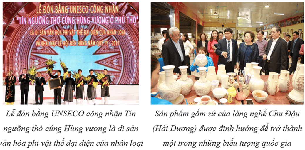 + Các lễ hội văn hóa truyền thống, những loại hình nghệ thuật dân gian, nghề truyền thống... được biểu hiện cụ thể ở mỗi vùng miền địa phương. Ví dụ: Lễ hội Đền Hùng; nghề truyền thống làm gốm sứ,…