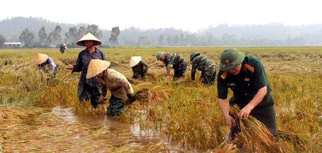 Lực lượng quân đội hỗ trợ nhân dân gặt lúa sau bão