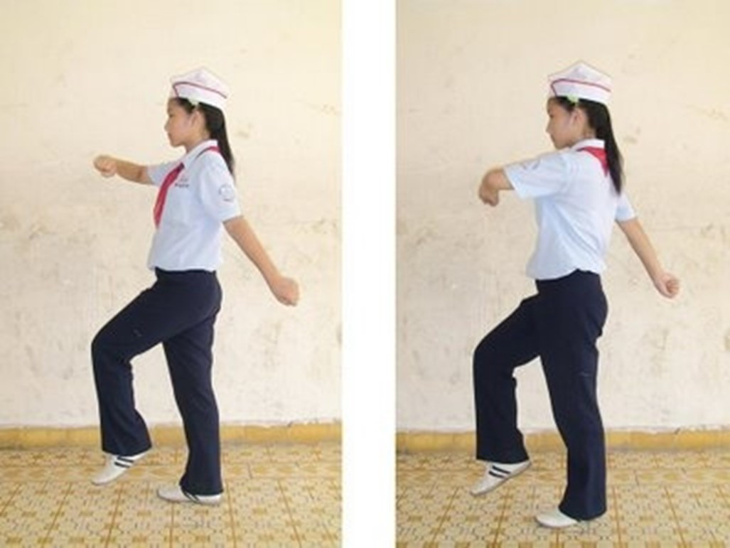- Động tác: Chân trái nhấc lên, mũi bàn chân cách mặt đất 30 cen-ti-mét (cm), tay phải đánh ra trước, tay trái đánh về sau như đi đều. Cứ như vậy, chân nọ tay kia phối hợp nhịp nhàng giậm chân tại chỗ với tốc độ 106 nhịp trong một phút