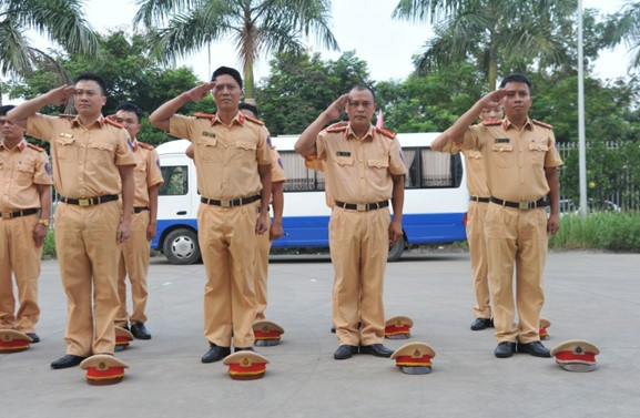 - Khẩu lệnh, động tác thực hiện như động tác chào, thôi chào khi đội mũ cứng, đầu ngón tay giữa chạm ở ngang đuôi lông mày bên phải.