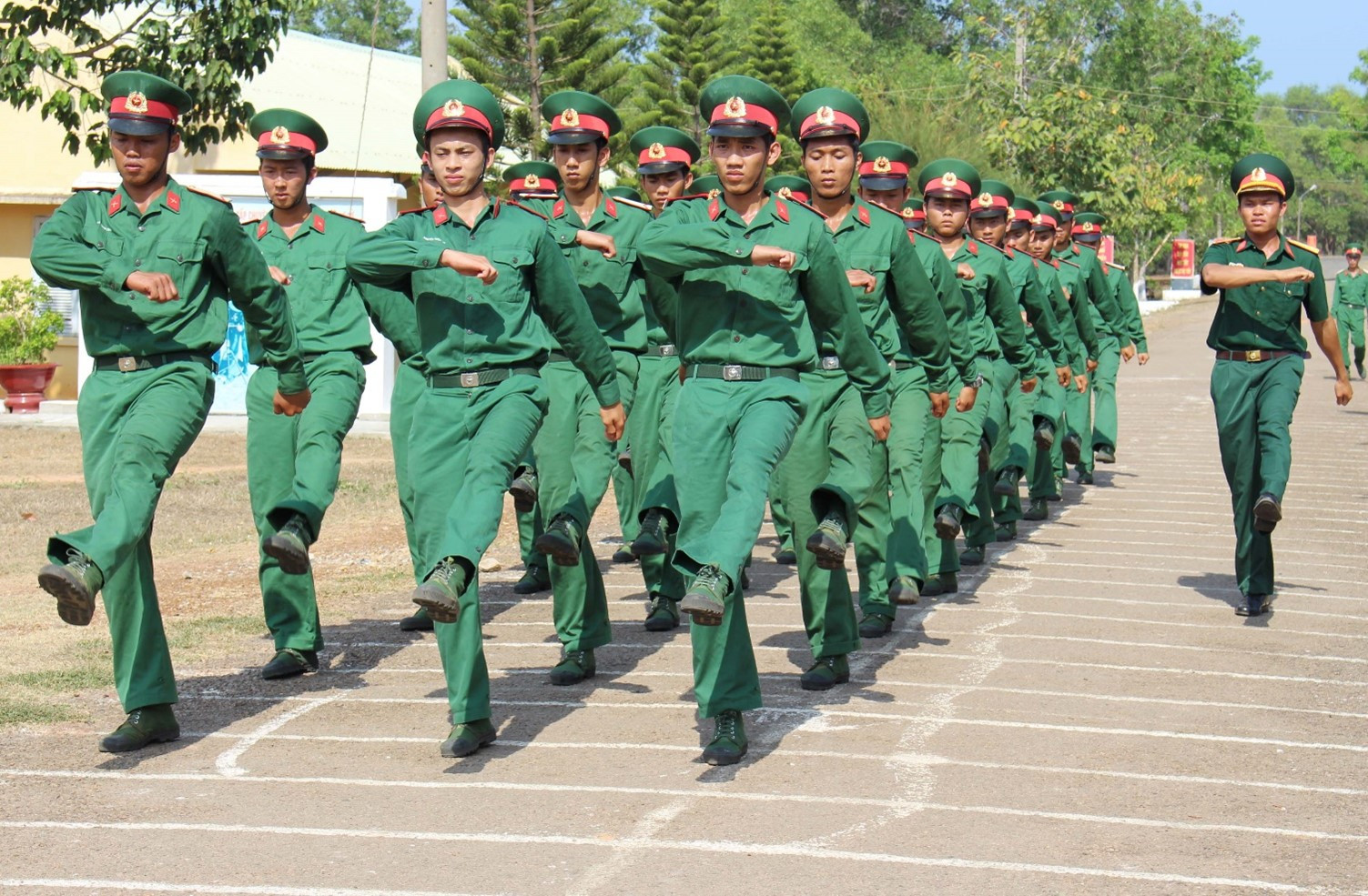 - Chú ý: Tay đánh ra phía trước phải giữ đúng độ cao và góc độ của cánh tay trên với thân người, cánh tay đánh ra phía sau thẳng tự nhiên, giữ đúng độ dài mỗi bước và tốc độ đi, người ngay ngắn (không nghiêng ngả, gật gù, mắt nhìn thẳng (không liếc mắt hoặc quay nhìn xung quanh), nét mặt tươi vui.