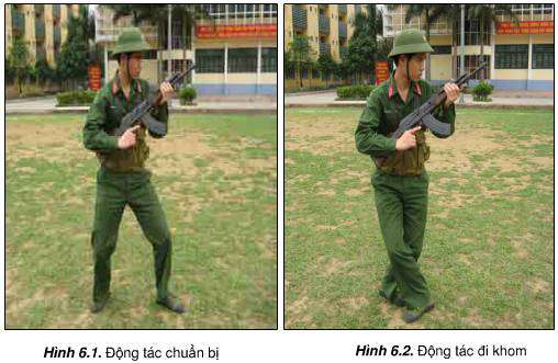 - Động tác đi khom thấp vận dụng trong trường hợp trong chiến đấu, học sinh phải khi ta ở tương đối gần địch, nơi địa hình có vật che đỡ, thực hiện động tác khám súng để che khuất cao ngang tầm ngực.