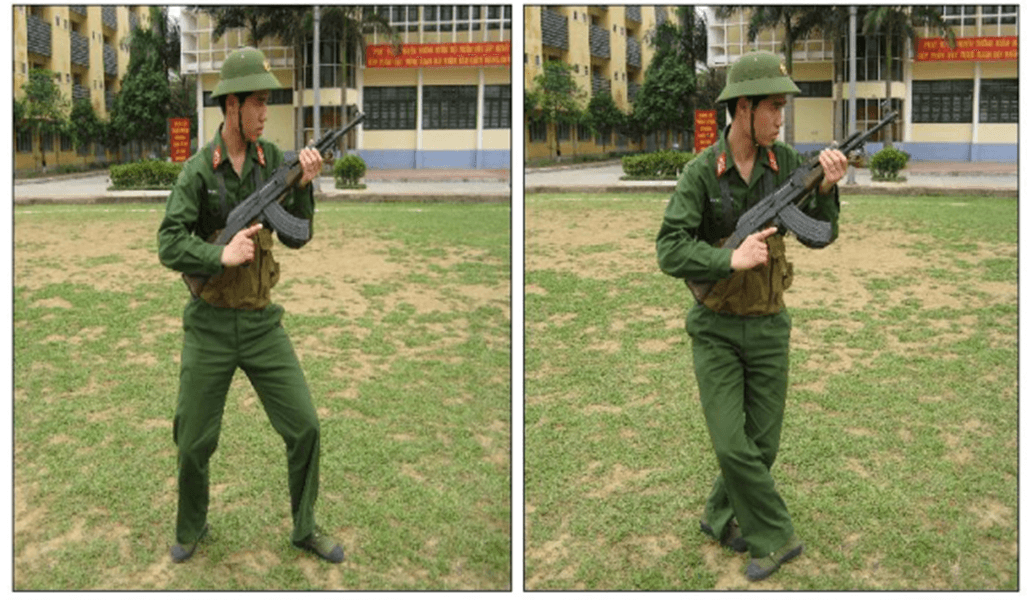 - Động tác đi khom khi chiến sĩ giữ sủng tiểu liên AK.