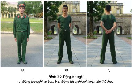 - Động tác nghỉ hai chân mở rộng bằng vai: áp dụng đối với thủy thủ khi đứng trên tàu và đối với tất cả các quân nhân khi tập thể dục, thể thao ( hình b, c )