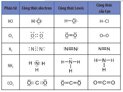 Bảng 10.1. Công thức electron, công thức Lewis và công thức cấu tạo của một số phân tử