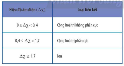 Bảng 10.2. Hiệu độ âm điện và loại liên kết tương ứng