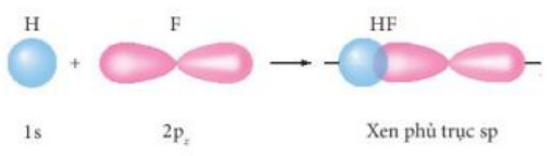 Hình 10.6. Sự xen phủ giữa orbital 1s của nguyên tử hydrogen và orbital 2p của nguyên tử fluorine hình thành liên kết σ trong phân tử hydrogen fluoride