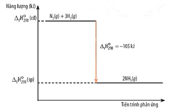 Ví dụ 2: Tính biến thiên enthanny của phản ứng tạo thành ammonia (sử dụng năng lượng liên kết ở Bảng 14.1). Cho biết phản ứng thu nhiệt hay tỏa nhiệt và vẽ sơ đồ biểu diễn biến thiên enthalpy của phản ứng.