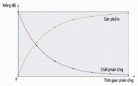Hình 15.1. Đồ thị biểu diễn sự thay đổi nồng độ chất phản ứng nồng độ của chất phản ứng và (màu tím) và sản phẩm (màu xanh) theo thời gian