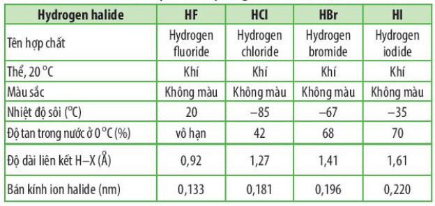 Bảng 18.1. Bảng mô tả đặc điểm, tính chất vật lí của hydrogen halide (HX)