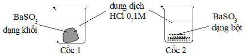 Bài 2: Cho 2 mẫu BaSO3 có khối lượng bằng nhau và 2 cốc chứa 50ml dung dịch HCl 0,1M như hình sau. Hỏi ở cốc nào mẫu BaSO3 tan nhanh hơn?