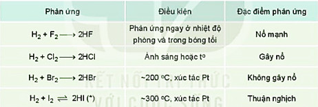 - Mức độ phản ứng của các halogen với hydrogen giảm dần khi đi từ fluorine đến iodine, phù hợp với tính oxi hóa của các halogen giảm dần từ F2 đến I2