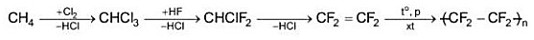 + Hydrogen fluoride được sử dụng trong quá trình sản xuất teflon theo sơ đồ: