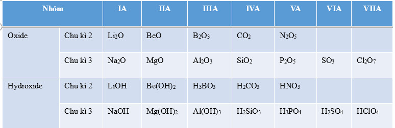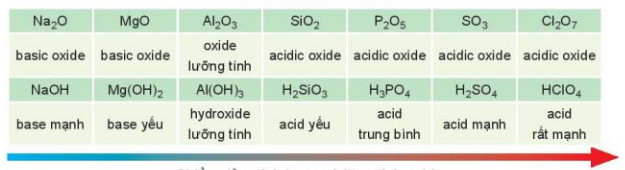 Trong một chu kì, theo chiều tăng dần của điện tích hạt nhân, tính base của oxide và hydroxide tương ứng giảm dần và tính acid của chúng tăng dần.