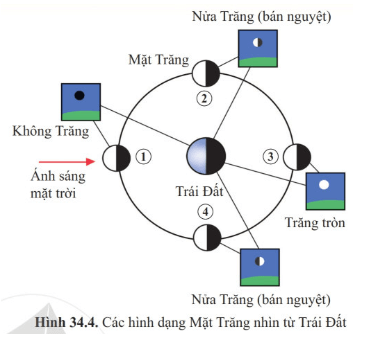 + Khi Mặt Trăng ở cùng phía với Mặt Trời, mặt tối của nó quay về phía Trái Đất cho nên chúng ta không thấy Mặt Trăng. Đó là ngày không trăng (vị trí 1 như hình 34.4).