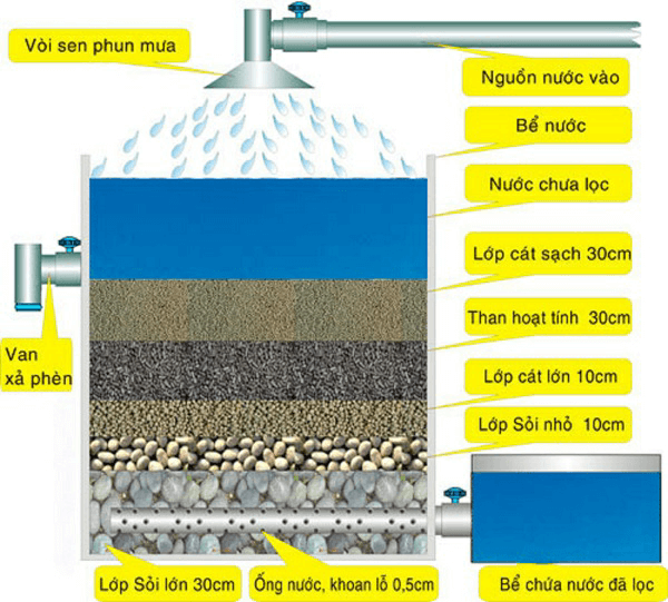 + Để loại bỏ những tạp chất ra khỏi nước giếng khoan, người ta thường sử dụng hệ thống lọc gồm nhiều cột lọc, có khả năng giữ các chất bẩn và tạp chất để làm trong nước.