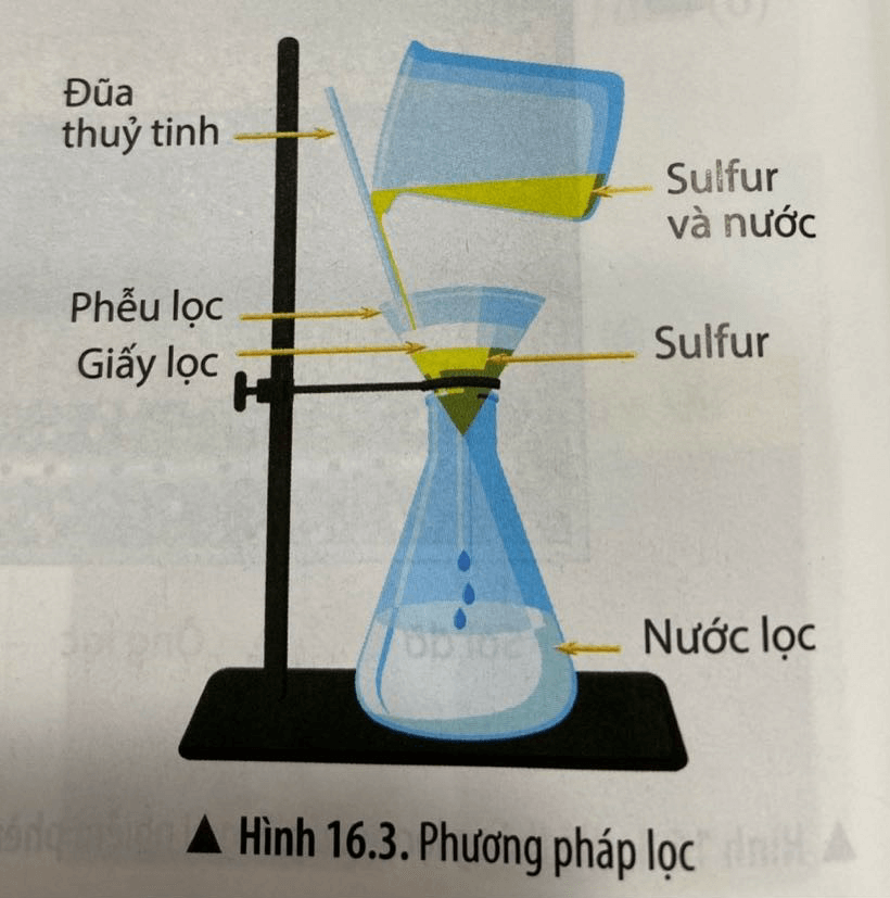 Ví dụ: Sulfur là chất rắn không tan trong nước. Sử dụng phương pháp lọc để tách riêng bột sulfur ra khỏi nước.