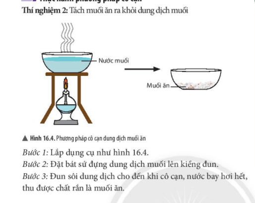 Ví dụ: Do muối ăn là chất rắn tan được trong nước nên không thể dùng phương pháp lọc để tách muối ăn ra khỏi nước. Mặt khác, muối ăn không bị hoá hơi khi đun nóng nên có thể dùng phương pháp cô cạn để làm bay hơi nước và thu được muối ăn ở dạng rắn.