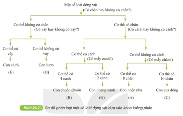 Lời giải Khi xây dựng khóa lưỡng phân, người ta sẽ bắt đầu bằng việc lựa chọn các đặc điểm để phân chia các loài sinh vật thành hai nhóm. Sau đó sẽ tiếp tục các làm như vậy ở các nhóm nhỏ tiếp theo cho đến khi xác định được từng loài. Cuối cùng thì sẽ lập sơ đồ phân loại các loài sinh vật.
