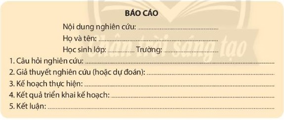 - Cấu trúc một bài báo cáo thường có các đề mục: tên đề tài nghiên cứu, câu hỏi nghiên cứu, giả thuyết khoa học, kế hoạch thực hiện, triển khai kế hoạch, rút ra kết luận nghiên cứu.