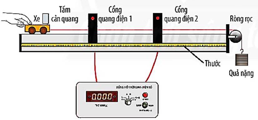 - Chuẩn bị: Hai cổng quang điện, đồng hồ đo thời gian hiện số, các dây dẫn, chiếc xe nhỏ có gắn tấm cản quang, quả nặng, ròng rọc (gắn cố định ở mép bàn), sợi dây chỉ (để nối xe với quả nặng), thước.