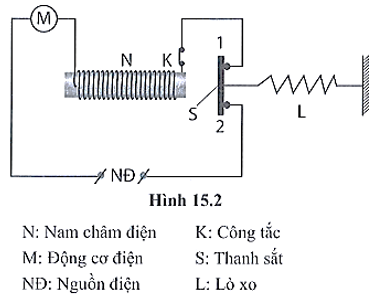 Bài tập 2: Hình 15.2 mô tả cấu tạo một thiết bị tự động ngắt mạch điện khi dòng điện trong mạch tăng quá mức cho phép (được gọi là rơ le dòng). Nam châm điện N ở thiết bị này có chức năng sau: Khi dòng điện qua nam châm điện ở mức cho phép thì thanh sắt S bị lò xo L kéo sang phải làm đóng các tiếp điểm 1, 2.