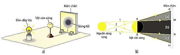 - Thí nghiệm tạo vùng nửa tối tạo bởi nguồn sáng rộng: Đối với nguồn sáng rộng, phía sau vật cản sáng có vùng hoàn toàn không nhận được ánh sáng (vùng tối b) và có vùng chỉ nhận được một phần ánh sáng từ nguồn sáng truyền tới (vùng nửa tối a, c) như trên Hình 15.6 a, b.