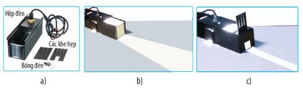 Hình 15.2. a) Hộp đèn tạo chùm sáng và khe hẹp; b) và c) Các chùm sáng