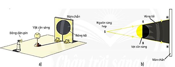 + Vùng không gian phía sau quả bóng không nhận được ánh sáng trực tiếp từ nguồn sáng nên là vùng tối và trên màn chắn xuất hiện bóng tối của vật cản (Hình 15.5a).