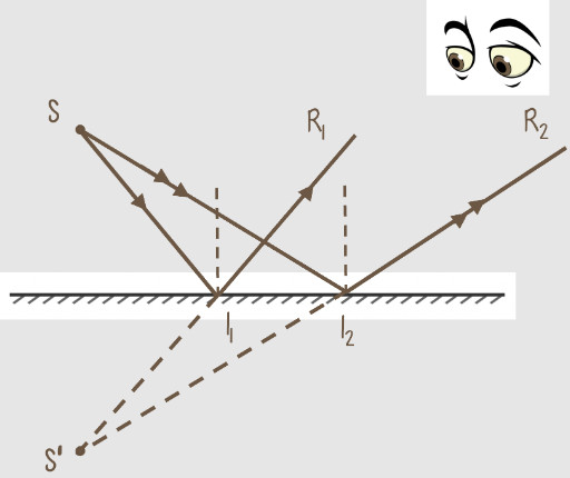 → Ta nhìn thấy ảnh ảo S' của S khi các tia phản xạ lọt vào mắt có đường kéo dài đi qua ảnh S'.