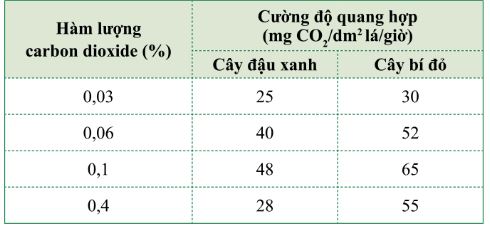 Bảng 19.2. Ảnh hưởng của hàm lượng CO2 đến quang hợp ở cây đậu xanh và cây bí đỏ