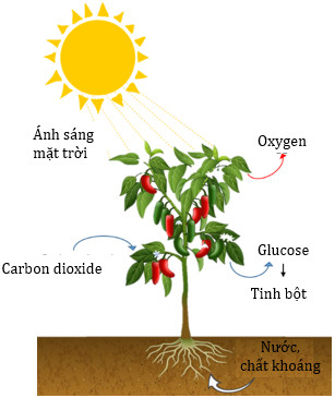 - Nước và carbon dioxide được lấy từ môi trường ngoài để tổng hợp chất hữu cơ (như glucose, tinh bột) và giải phóng oxygen. Cũng trong quá trình này, quang năng chuyển thành hóa năng dự trữ trong các hợp chất hữu cơ.