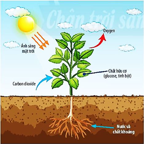 + Nước và khí carbon dioxide được chuyển đến lục lạp ở lá cây để tổng hợp thành chất hữu cơ (glucose hoặc tinh bột) và giải phóng khí oxygen.