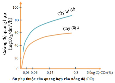 Hình 23.2. Đồ thị thể hiện ảnh hưởng của nồng độ khí CO 2 ngoài môi trường đến quang hợp ở cây bí đỏ và cây đậu. Nguồn: Giáo trình sinh lí thực vật, NXBGDVN