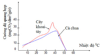 Hình 23.3. Đồ thị thể hiện ảnh hưởng của nhiệt độ đến quang hợp của cây khoai tây và cây cà chua. Nguồn: Giáo trình sinh lí thực vật, NXBGDVN