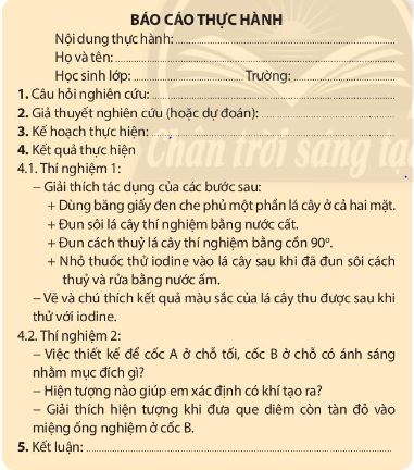 Thí nghiệm 1: - Dùng bằng giấy đen che phủ một phần là cây ở cả hai mặt: làm cho lá cây không tiếp xúc được với ánh sáng, để kiểm tra xem lá có quang hợp được trong điều kiện không có ánh sáng không. - Đun sôi lá cây thí nghiệm bằng nước cất: để ngưng các hoạt động sống của tế bào. - Đun cách thủy là cây thí nghiệm bằng cồn 90°: để tẩy chất diệp lục trong lá - Nhỏ thuốc thử iodine vào lá cây sau khi đã đun sôi cách thuỷ và rửa bằng nước ấm: kiểm tra sự có mặt của tinh bột trong các phần của lá - Kết quả màu sắc của lá cây thu được sau khi thử với iodine: Có sự khác biệt về màu sắc lá sau khi nhỏ iodine giữa 2 vùng có bịt băng giấy đen và không bịt băng giấy đen. Phần không che băng giấy đen hóa xanh khi thử với iodine vì tạo ra được tinh bột. Thí nghiệm 2: - Việc thiết kế để cốc A chỗ tối, cốc B ở chỗ có ánh sáng nhằm mục đích khi không có ánh sáng lá cây sẽ không thực hiện quá trình quang hợp, kết quả sẽ không tạo khí oxygen. - Hiện tượng có bọt khí xuất hiện chứng tỏ đã có khí tạo ra ở cốc B khi được đặt nơi có ánh sáng. - Hiện tượng khi đưa que diêm còn tàn đỏ vào miệng ống nghiệm ở cốc B: que diêm bùng cháy do khí oxygen duy trì sự cháy |