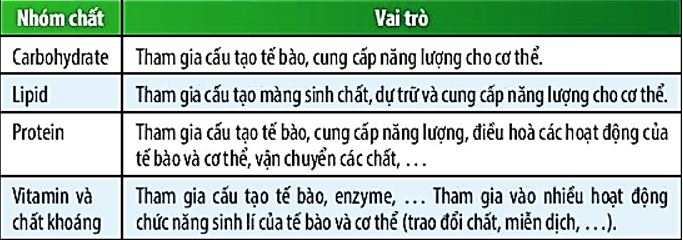 Bảng 28.1. Vai trò của các nhóm chất đối với cơ thể sinh vật