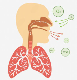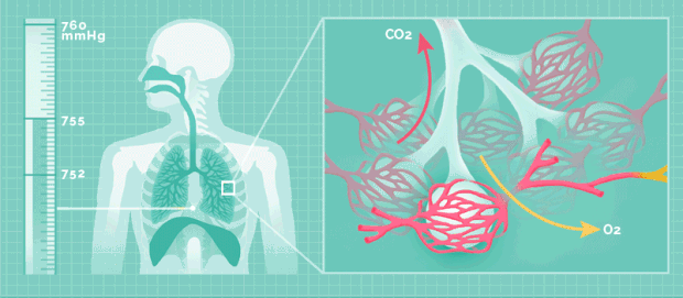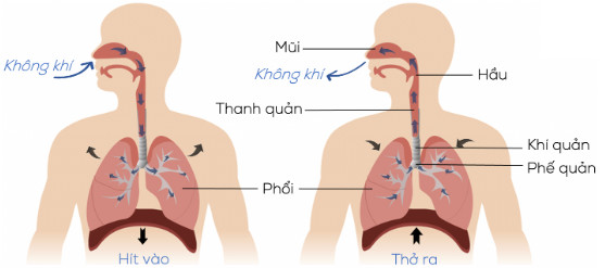 | Ở người, khi hít vào, không khí đi đi qua đường dẫn khí vào đến phổi sẽ cung cấp O2 cho các tế bào; khí CO2 từ tế bào được máu chuyển tới phổi để thải ra ngoài môi trường qua động tác thở. |
